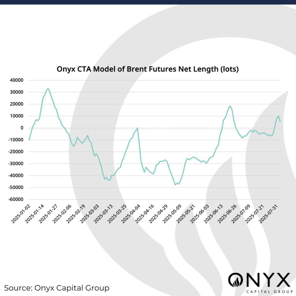 From a technical perspective, Brent is in a relatively balanced state. Prices are sandwiched between the structural 100-day and 200-day moving averages, delineating support and resistance levels. Last week, prices attempted, but failed, to break above the upper span of the Ichimoku cloud and instead retreated to the cloud’s lower span. Bullish momentum is fading, as indicated by the weakening RSI and MACD. Regarding positioning, our CTA model projects a softening of Brent futures net length on 4 August. Bollinger band widths remain relatively narrow compared to June-July levels, suggesting that a break beyond key support or resistance levels could trigger a sustained move.