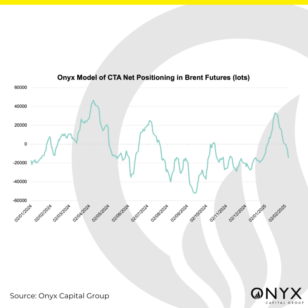 The crude sell-off was fuelled by CTAs getting shorter, as indicated by Onyx’s proprietary model. Net positioning in Brent futures fell below flat, from a peak of 33k lots on 17 January to -14k lots by 07 February, the lowest level since 30 December. The unidirectional bearish flow by CTAs likely exacerbated the flat price downtrend this week. In addition, prices were vulnerable to a bearish reversal because of the overcrowding of bullish positioning by money managers in Brent futures. The latest ICE COT data in the week ending 28 January showed that net positioning was at the highest level since April 2024. Given the recent sell-off, our CFTC predictor forecasts money managers to trim their positions in Brent futures for the week ending 05 February.
