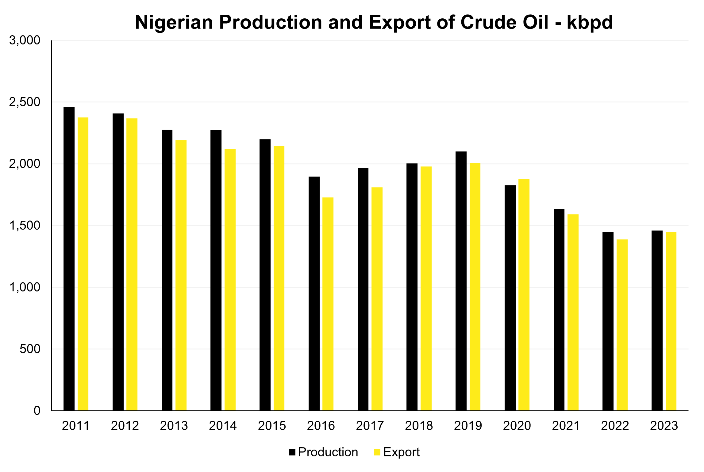 Nigeria pumped out 1.18mbbls of crude oil in April 2023 and is forecast to produce 1.46mbbls of crude in 2023, exporting around 1.45mbbls.