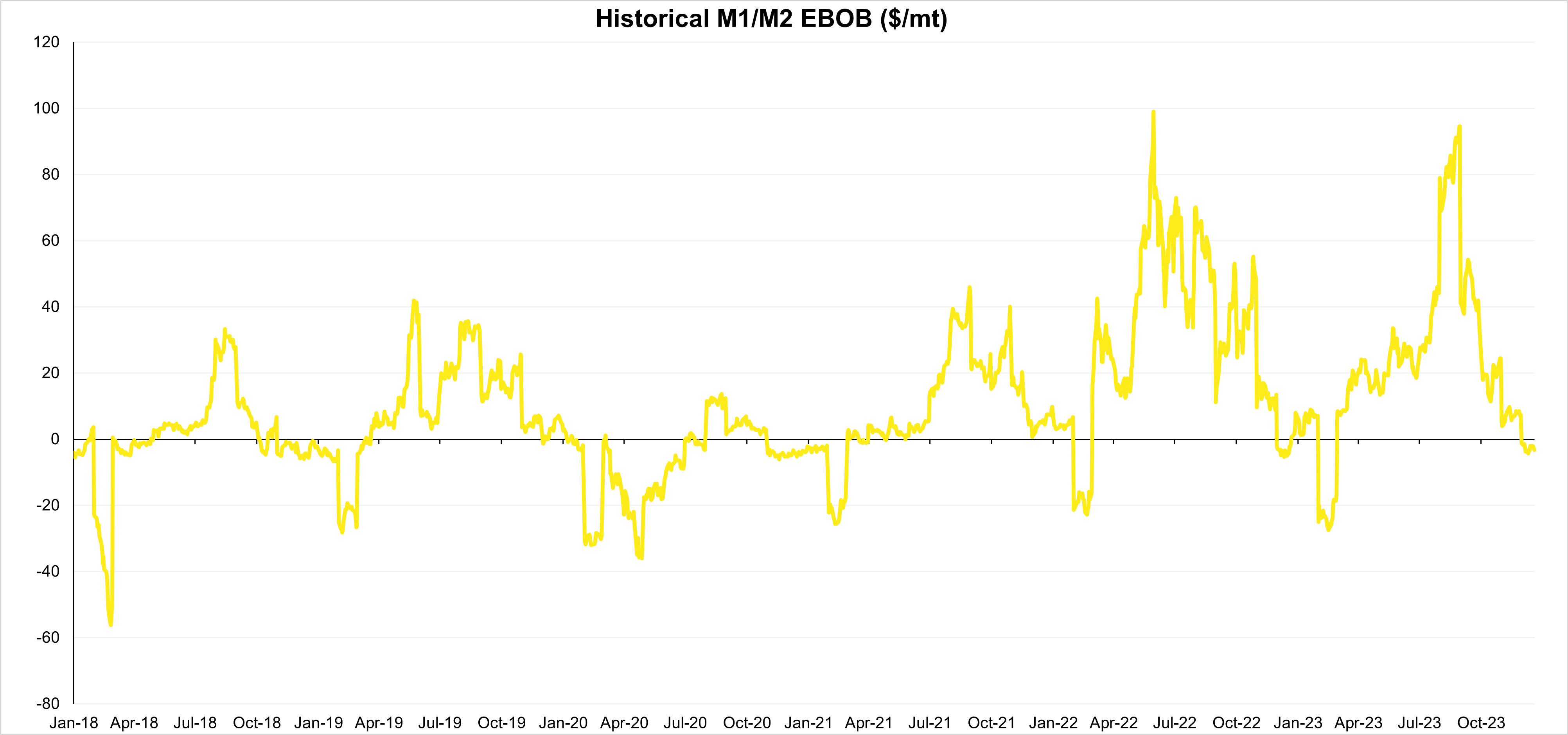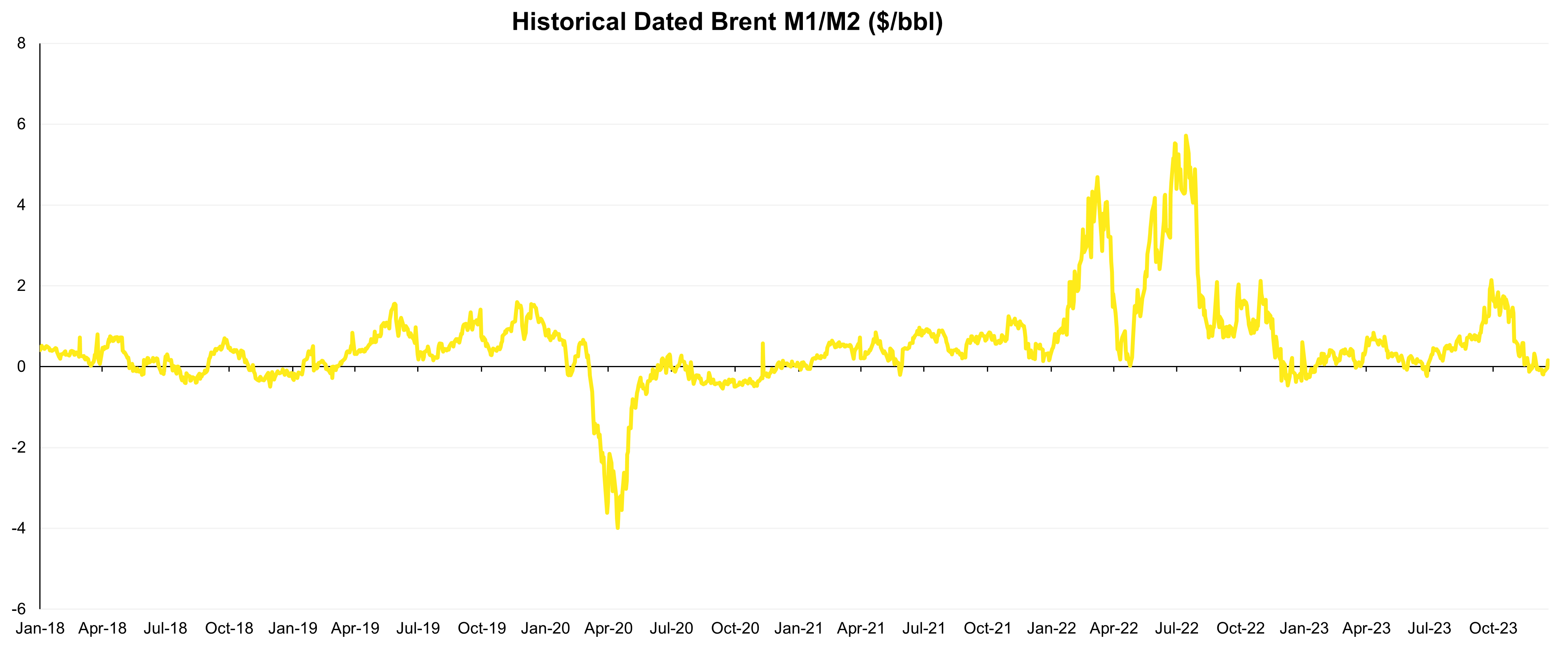 Tightening supplies for sweet crude could bring about bullish tides for the benchmark Dated Brent. The front Dated spread recently entered contango territory over concerns that lacklustre demand would forge a supply overhang in oil. Previous notable peaks in the front spread were reached on 9th October this year, when the spread reached a yearly apex of $1.84/bbl on the back of volatility arising from the Israel-Hamas war and concerns over it impacting oil supply. Before this, we observed an even more substantial summit nearing $6/bbl in 2022 over the Russia-Ukraine war. While the gradual rise in the Dangote refinery’s functioning is not a macroeconomic shock and will thus likely not result in heights as severe as these, the market may price in a small rally in spreads with each announcement accentuating increasing withdrawals of Nigerian crude.