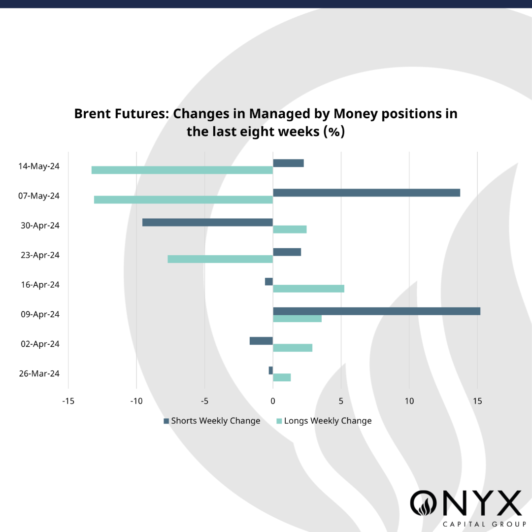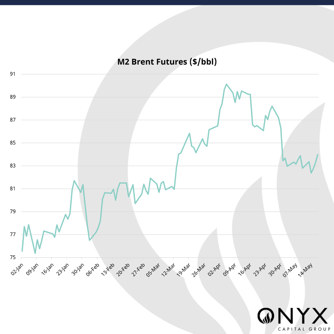 Despite the aforementioned forces of geopolitical risk premia, the mixed economic outlook and continued removal of longs from a previously overextended speculative length bring short-term neutral-to-bearish tides for the benchmark futures. In line with this, CFTC data for the week to May 14 flag a liquidation of nearly 45mbbls of length (-13.30% w-o-w) alongside an addition of almost 2mbbls of new short positions. Hence, we expect prompt Brent prices to print between $82-84/bbl come Friday.