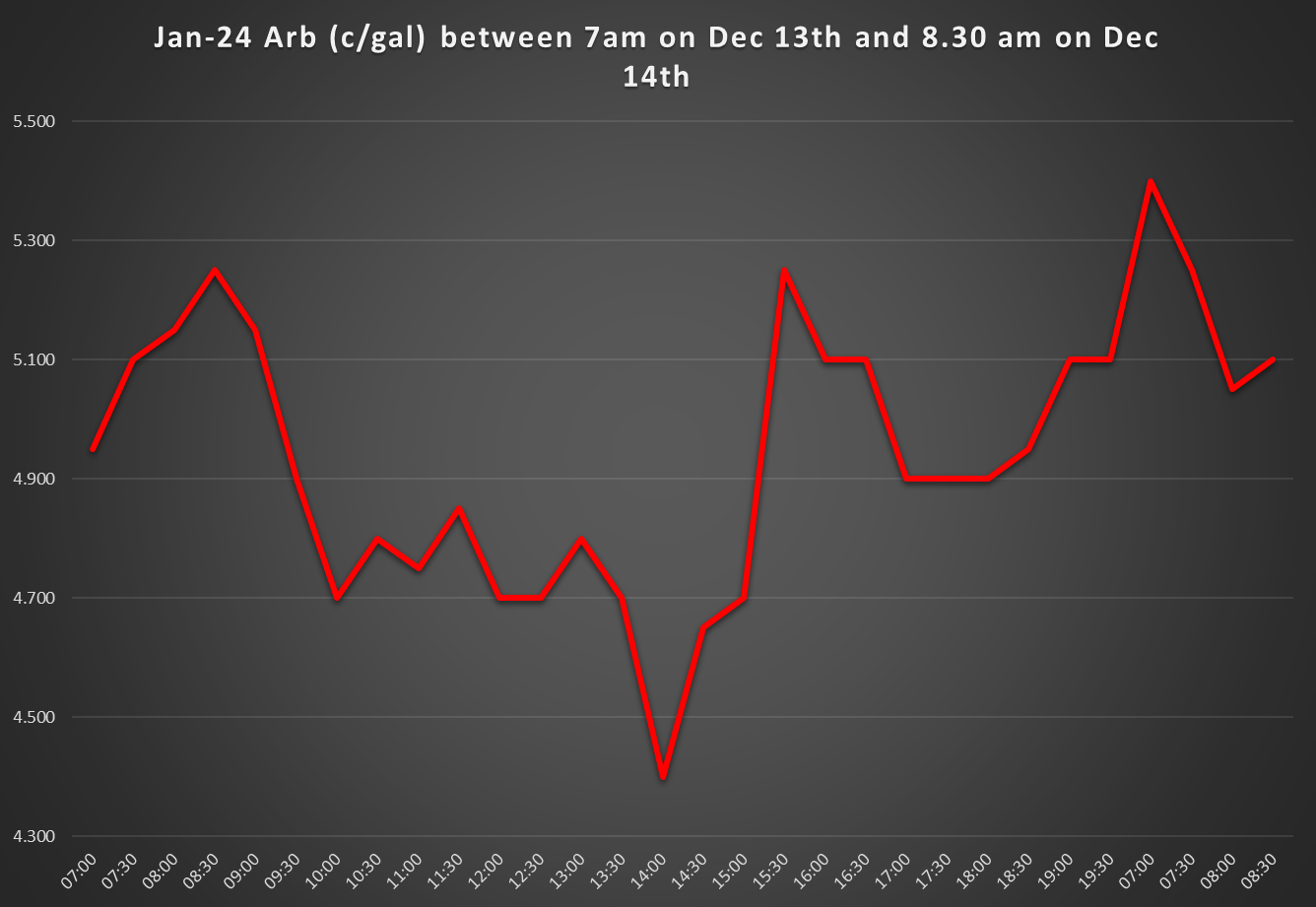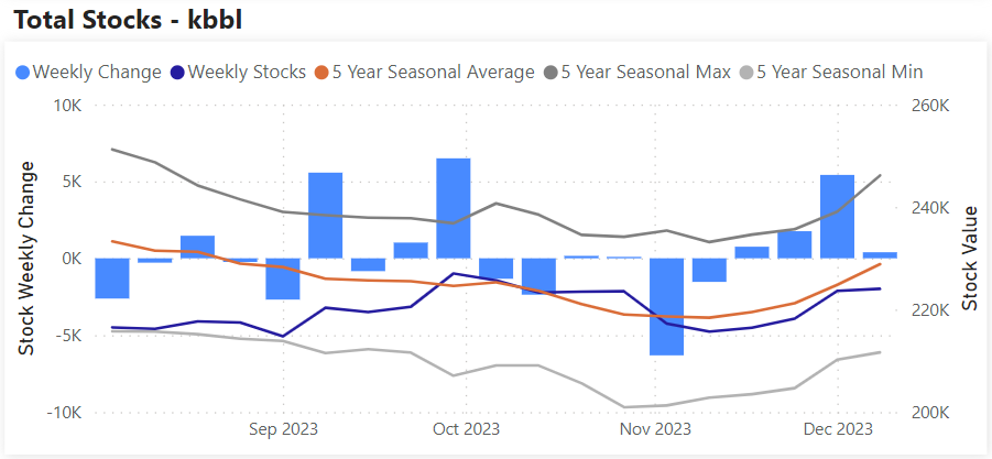 Gasoline stocks in the US saw inventories increase by 410kbbls in the week to Dec 8th, larger than expectations of 3.4mbbl build, with stocks now sitting at 224mbbls.