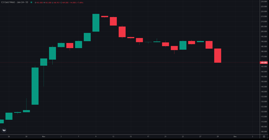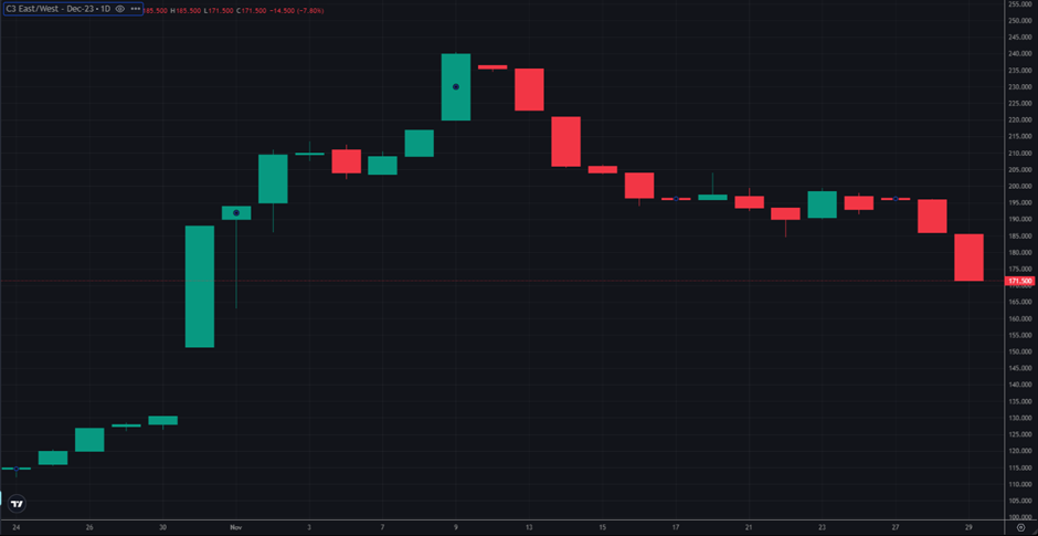 Reflecting these market dynamics, the front EW has seen a retracement from its early month peak of around $240/mt to the current levels hovering at approximately $171.50/mt while Jan has shifted lower below the $170/mt handles.